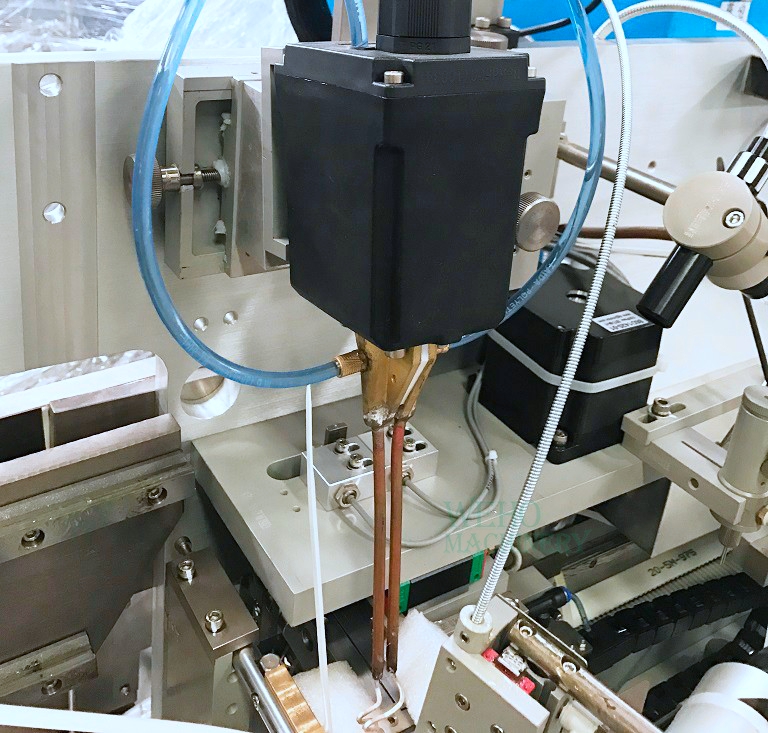 Elección automática de diente, alimentación, plegado de orejeta de soldadura para moldear, centrado y soldadura.