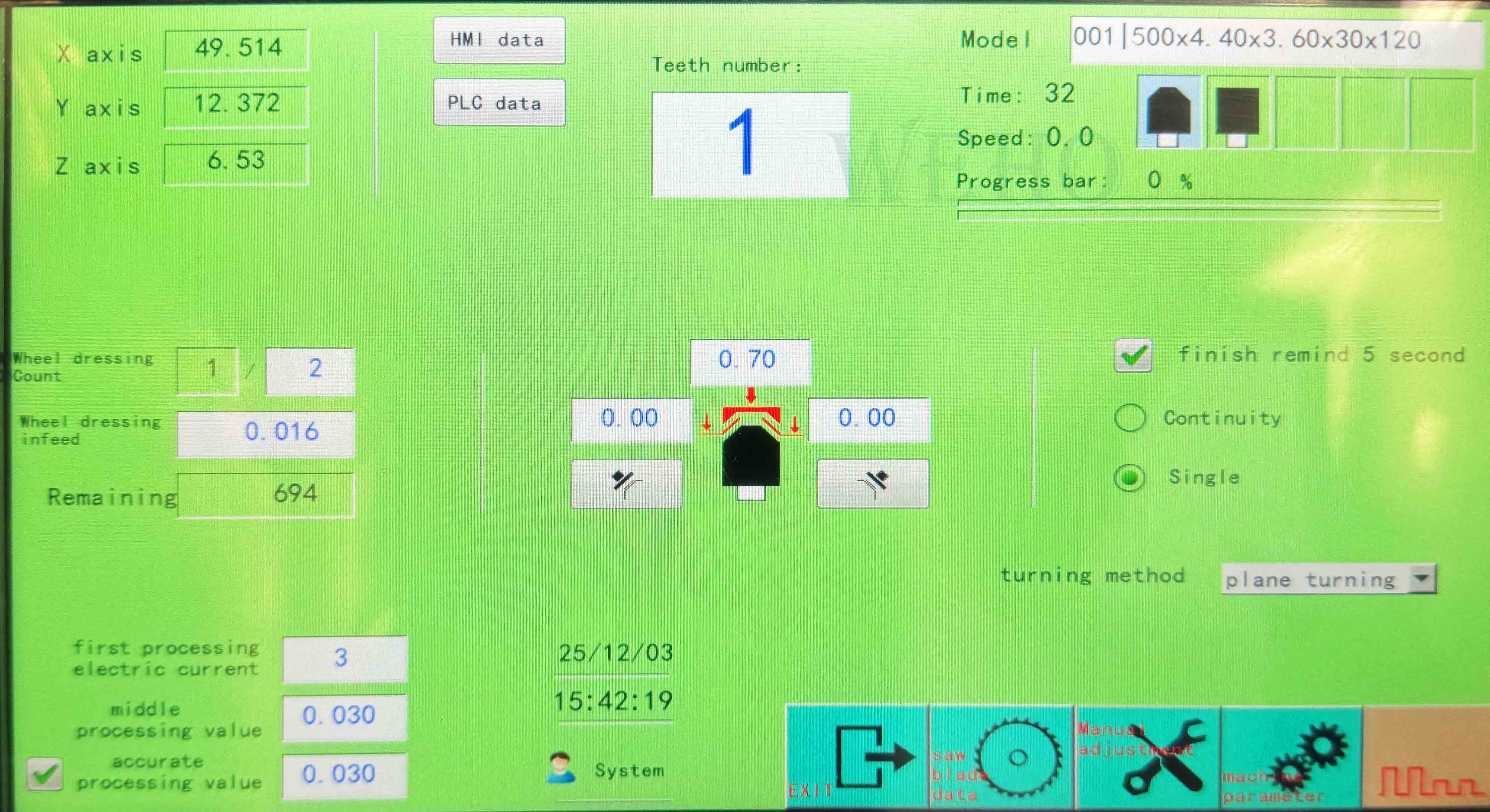 En el proceso de mecanizado, la pérdida de la rueda del electrodo se puede configurar de antemano y la compensación de giro se puede realizar nuevamente durante el proceso de mecanizado, para evitar la precisión de mecanizado inexacta causada por la pérdida del electrodo durante el proceso de mecanizado. Todo el proceso de operación no solo es conveniente y rápido, sino que también mejora efectivamente la precisión de la producción de la hoja de sierra, el proceso de procesamiento de herramientas de múltiples dientes se puede completar automáticamente sin intervención humana.