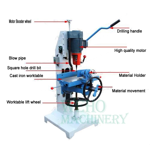 Se utiliza principalmente para perforar agujeros de mortaja redondos o cuadrados. Adopta movimiento neumático para el cabezal de perforación; la mortajadora adopta un dispositivo especial de soplado de polvo que utiliza la potencia del motor; el banco de trabajo adopta un sistema de elevación y movimiento de guía de cola de milano.